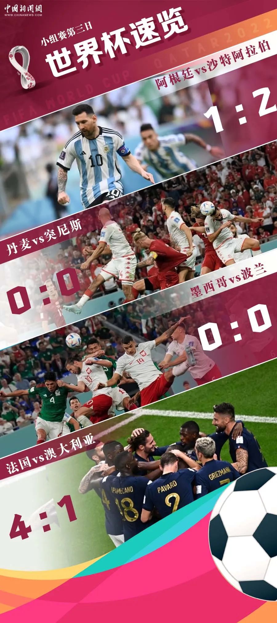 北京时间昨夜今晨,卡塔尔世界杯进入小组赛第三日,共展开四场角逐。 梅西领衔的阿根廷队“大热倒灶”,首秀即遭沙特队2:1逆转,这也是本届世界杯开赛以来的最大冷门。而凭借拉比奥、吉鲁和姆巴佩的进球,卫冕冠军法国队完成逆转,最终4:1击败澳大利亚队,取得开门红。