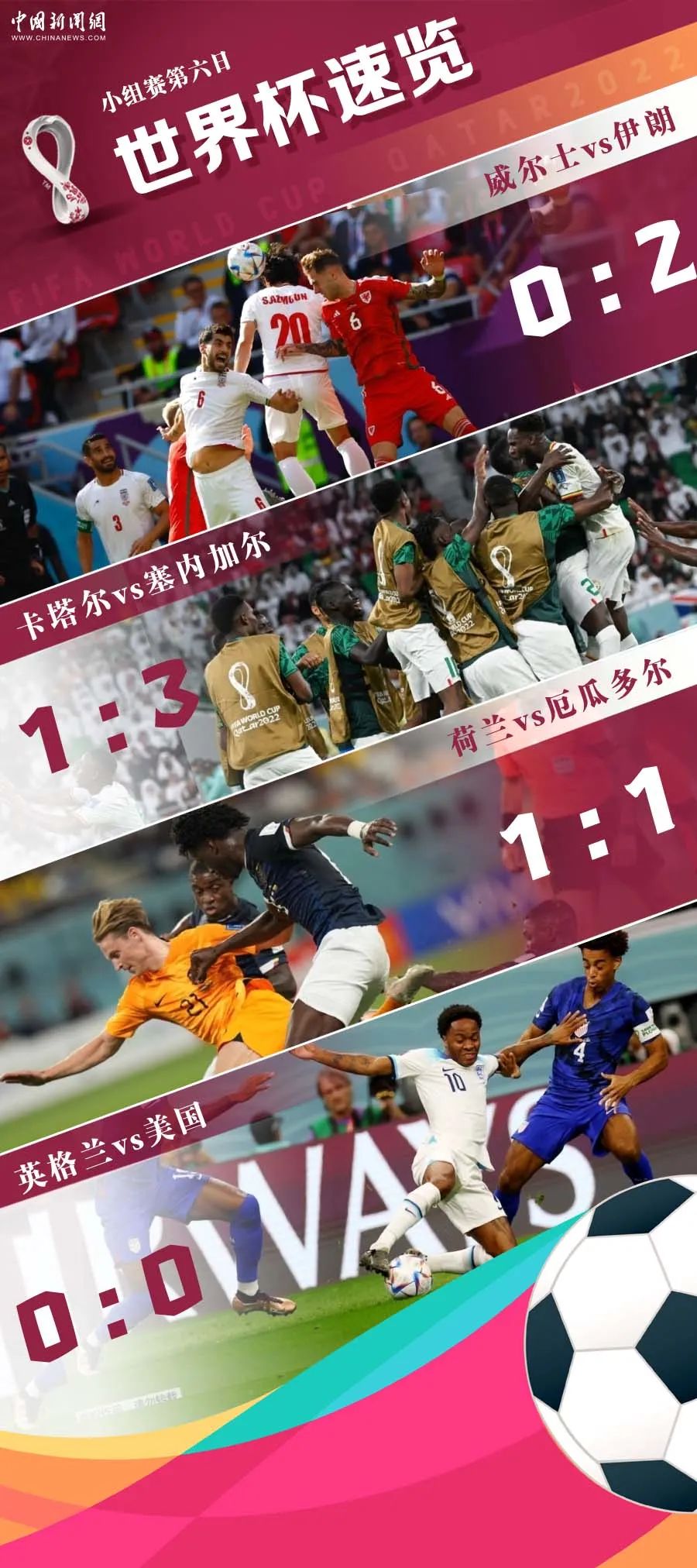 进球出现在下半场补时第7分钟和第10分钟,切什米与雷扎扬帮助伊朗队拿到了至关重要的3分。这也是亚洲球队本届杯赛的第三场胜利。 在英格兰队和美国队之间展开的“football与soccer之争”,最终以0:0互交白卷。英格兰队的“青春风暴”熄了火,反倒是美国队创造出了几次不错的得分机会,普利西奇还打中了一回横梁。 目前英格兰积4分位居B组第一,其后是3分的伊朗、2分的美国和1分的威尔士。四支球队末轮均有晋级的希望,也都有被淘汰的可能。