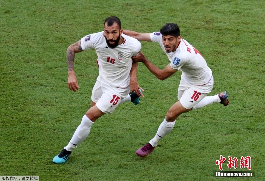 图为伊朗队15号球员切什米(左)庆祝进球。