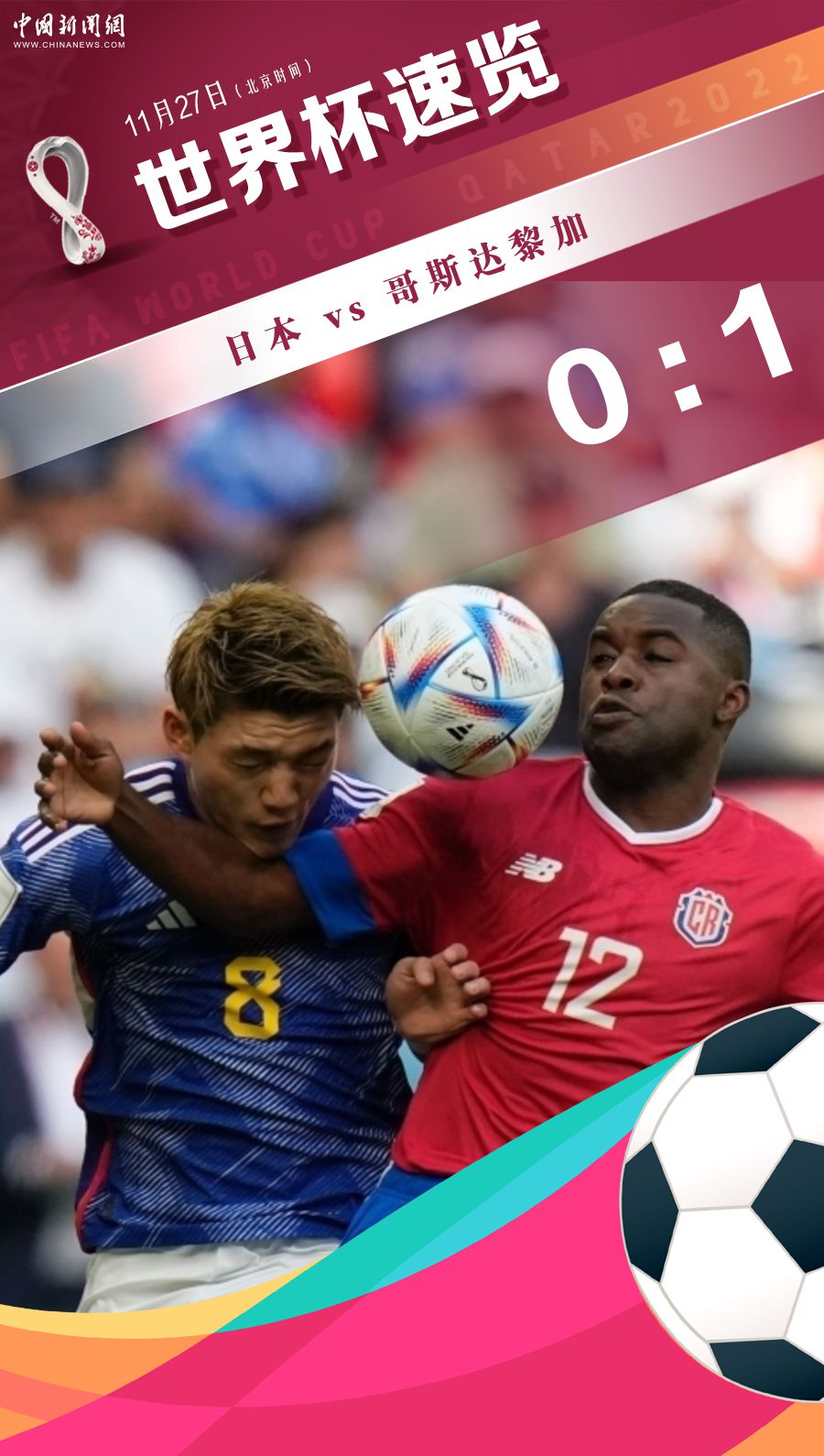 下半场易边再战,日本队阵容发生变化,浅野拓磨和伊藤洋辉登场,日本队攻势不断加强。第60分钟,日本队获得任意球机会,相马勇纪操刀直接射门,但皮球高出了球门。第69分钟,哥斯达黎加球员犯规,镰田大地主罚任意球,但被人墙挡出。 第81分钟,哥斯达黎加球员富勒抓住日本队的失误,成功将皮球送入网中。1:0的比分最终保持到终场哨响,哥斯达黎加1:0战胜日本。 E组第二轮第二场比赛,西班牙对阵德国,将于北京时间28日03:00开始。(完)