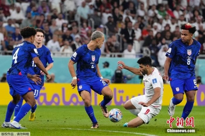 北京时间11月30日,卡塔尔世界杯小组赛B组第3轮,伊朗队对阵美国队。凭借普利希奇在第38分钟的进球,美国队1:0战胜伊朗队,小组赛一胜两平积5分,排名B组第二,晋级十六强。伊朗队一胜两负积3分,排名小组第三,无缘出线。图为双方争抢皮球。