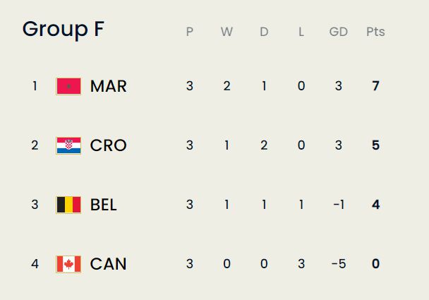 F组最后一轮两场比赛的结果为:摩洛哥2:1击败加拿大,克罗地亚0:0战平比利时。最终摩洛哥积7分排名小组榜首,克罗地亚位居次席。以1胜1平1负收官的比利时队仅积4分,小组出局。