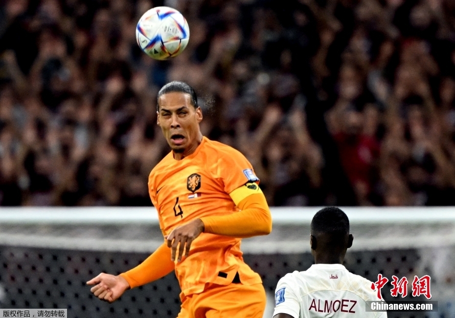 北京时间11月29日,卡塔尔世界杯小组赛A组第3轮,荷兰队对阵东道主卡塔尔队的比赛正式打响。图为荷兰队球员范迪克(橙)头球。