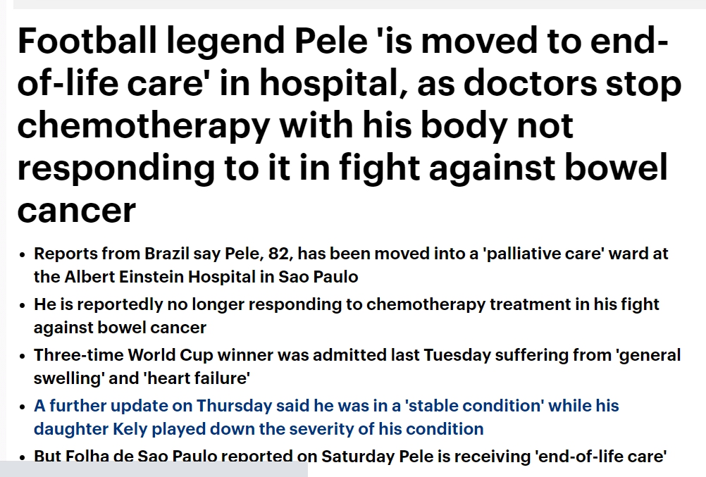 据《每日邮报》以及巴西媒体《圣保罗页报》等多家媒体消息,患有癌症的82岁球王贝利已经对化疗无反应,目前正在接受姑息治疗,进入临终关怀阶段。