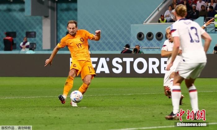 北京时间12月3日,卡塔尔世界杯八分之一决赛,荷兰队对阵美国队的比赛正式打响。图为荷兰队球员(橙)射门。