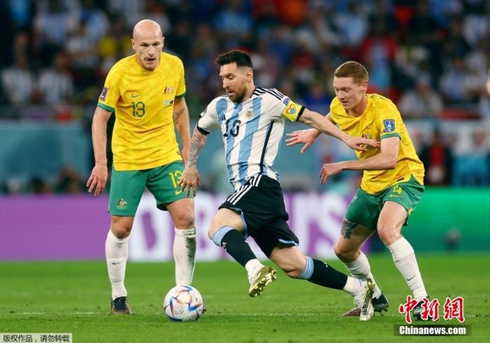北京时间12月4日,卡塔尔世界杯八分之一决赛,阿根廷队对阵澳大利亚队的比赛正式打响。图为阿根廷队球员梅西(蓝)带球。