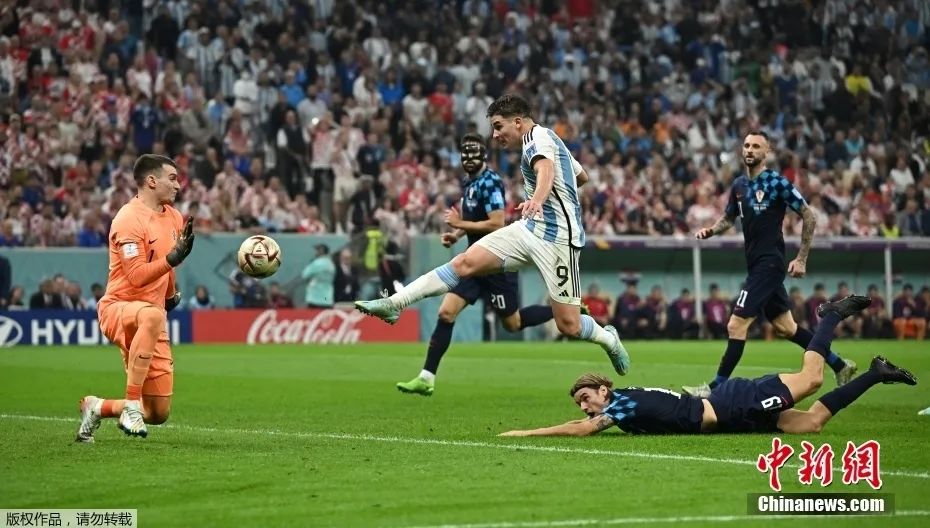 上半场结束前,阿根廷队在相持中突然发力,于短短5分钟内连入两球。 恩佐-费尔南德斯的传球帮助阿尔瓦雷斯形成单刀,后者突入禁区后被克罗地亚门将利瓦科维奇撞倒,裁判判罚点球。梅西一蹴而就,将个人世界杯进球数提升至11个,创现役球员新纪录。随后阿根廷队卷土重来,刚刚创造点球的阿尔瓦雷斯完成一条龙破门,将比分扩大为2:0。