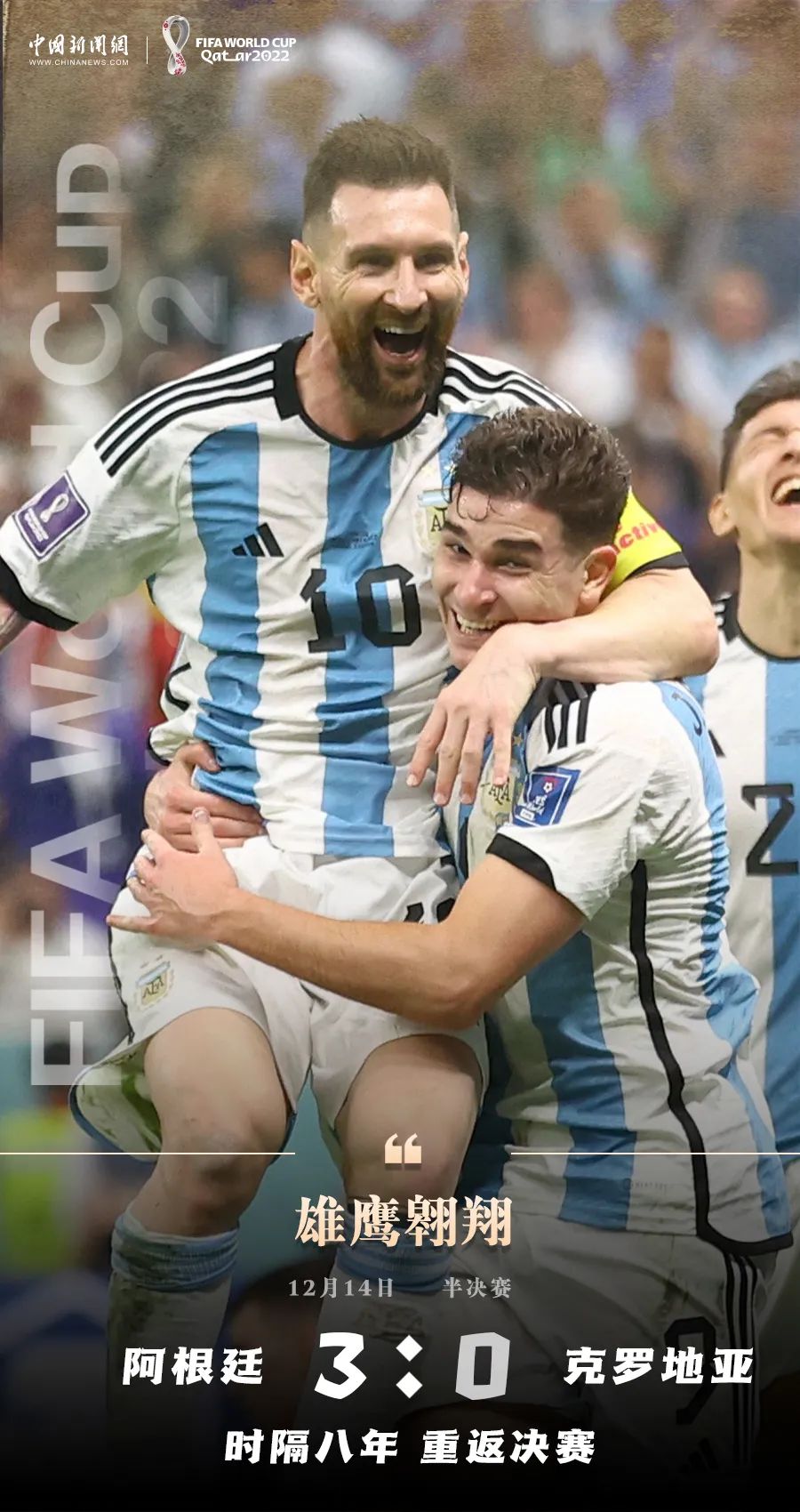 梅西率领阿根廷3:0击败克罗地亚,时隔八年重返世界杯决赛。而拥有莫德里奇的格子军团遗憾止步,无缘连续两届杯赛走到最后。