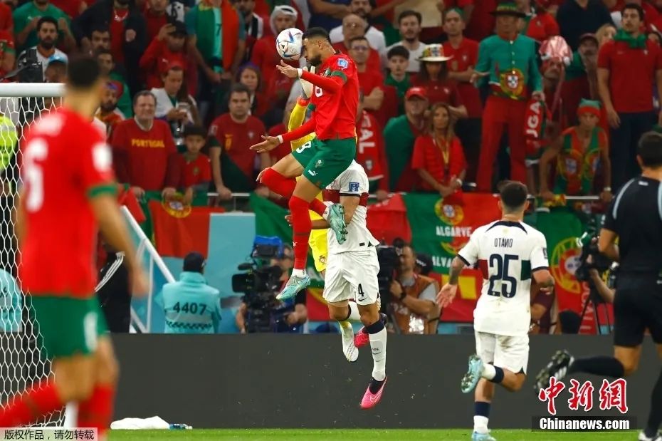 图为摩洛哥前锋恩内斯里(红)头球攻门。中新社记者 富田 摄