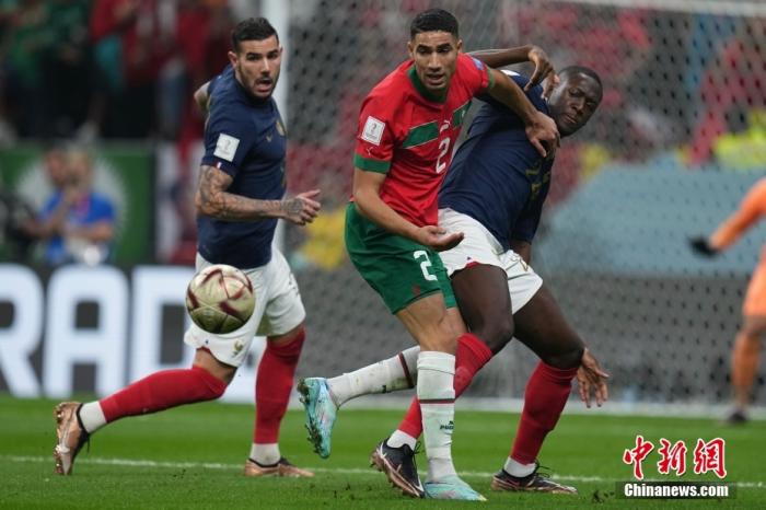 北京时间12月15日,卡塔尔世界杯半决赛,法国队对阵摩洛哥队。上半场第5分钟,特奥·埃尔南德斯进球,为法国队先拔头筹。下半场第79分钟,姆巴佩禁区内制造混乱,刚替补出场的科洛·穆阿尼破门。最终,法国队2:0战胜摩洛哥队,晋级决赛。卫冕冠军法国队将与阿根廷队争夺本届世界杯冠军。图为比赛现场。中新社记者 崔楠 摄