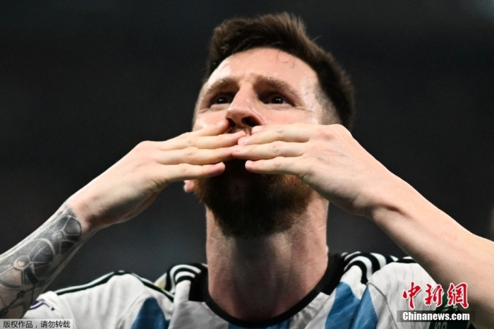 当地时间11月26日,在阿根廷队和墨西哥队的生死战中,梅西在下半场第64分中打入挽救球队的一球。与队友一起庆祝完进球后,独自站在场边的梅西向观众席的方向送去飞吻。距他不远处,是一幅马拉多纳的海报画像。