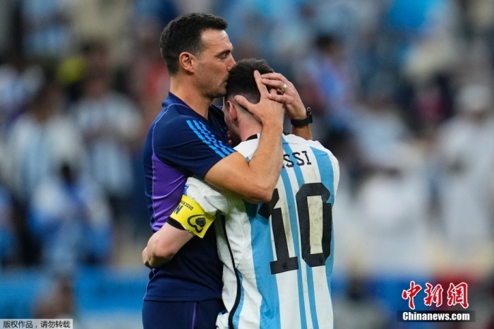资料图:当地时间12月10日,世界杯1/4决赛,阿根廷队与荷兰队的点球大战结束后,阿根廷队主教练斯卡洛尼亲吻着梅西的头部。