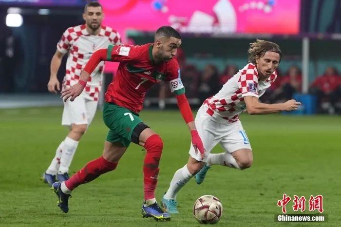 摩洛哥虽遗憾告负 但仍创非洲球队历史最佳战绩 历史上第4次向世界杯四强 发起冲击的非洲足球 终于得偿夙愿 克罗地亚与摩洛哥 都是胜利者 北京时间12月17日晚23点,2022卡塔尔世界杯季军赛在哈利法体育场打响,克罗地亚队迎战摩洛哥队。图为摩洛哥队球员(红)带球。中新社记者 崔楠 摄