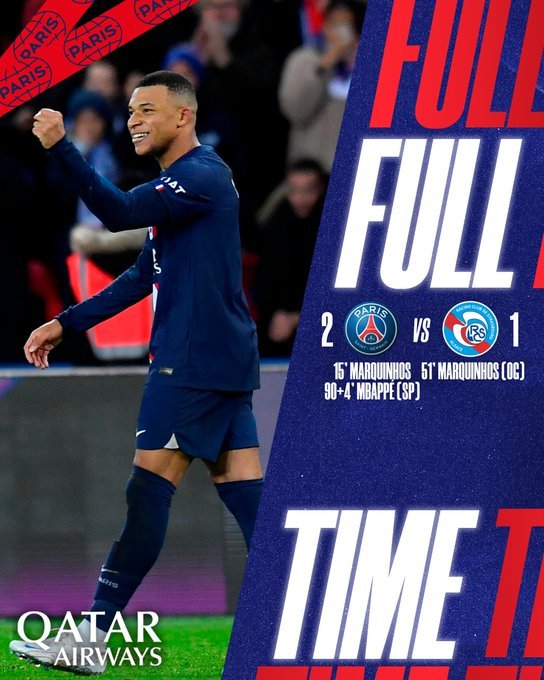最终,巴黎圣日耳曼2:1击败斯特拉斯堡。本场比赛后,大巴黎继续排名联赛榜首。