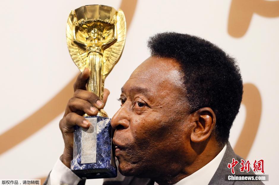 2016年6月1日,英国伦敦,贝利个人纪念收藏品亮相伦敦莫尔画廊展出,老球王现身亲吻昔日奖杯。据悉,巴西球王贝利宣布,他将拍卖超过2000件以上的个人藏品。为期三天的拍卖将在伦敦举行。