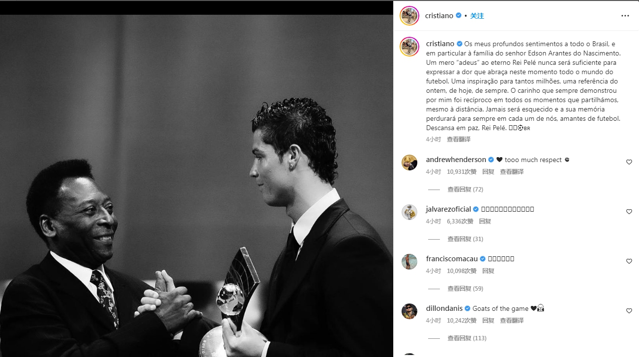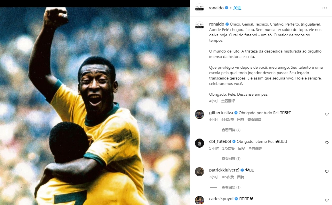 罗纳尔多写道,今天和永远,我们都会为你欢呼呐喊,谢谢你贝利。“你是唯一的一个,最伟大的一个,技术超群,富有创造力,完美的人。无可比拟的存在。这就是贝利达到的成就,足球之王,只有一个。有史以来最伟大的球员。很荣幸站在你身后,我的朋友。”