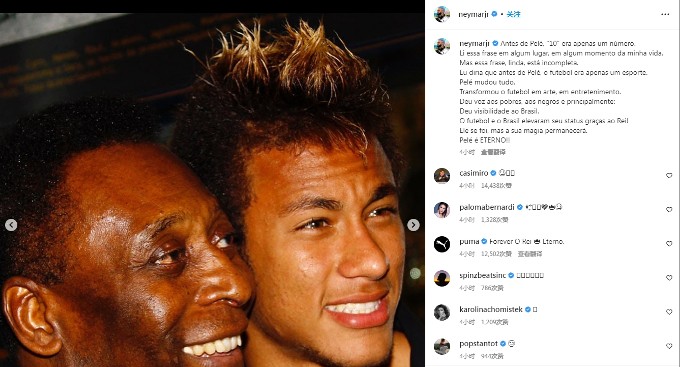 巴西球星内马尔表示,在贝利之前足球只是一项运动,贝利改变了一切。“贝利把足球变成了艺术。多亏了他,足球和巴西提升了他们的地位。他走了,但他的魔法仍然存在。永远的贝利!”