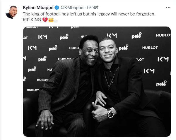 法国前锋姆巴佩在社交媒体表示,“足球之王离开了,但他留下的财富永远不会被遗忘。RIP,国王” 。 贝利1940年10月23日出生于巴西特雷斯科拉索斯,1957年入选巴西国家足球队。贝利曾代表巴西队夺得1958年、1962年、1970年三届世界杯冠军,是世界上唯一三次夺取世界杯冠军的足球运动员。退役后,贝利被国际奥委会、国际足联等授予多项荣誉。