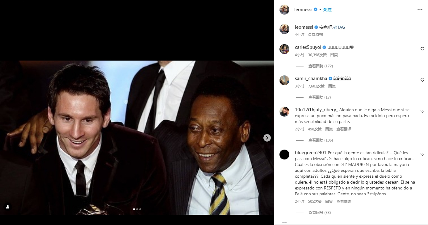 在个人社交媒体上,梅西上传与贝利的合照,并配文道“安息吧”。