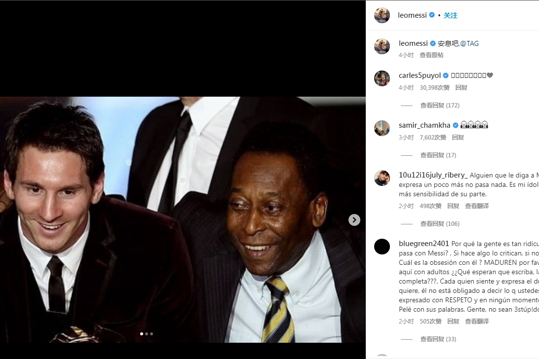 众人的道别之词中,用到最多的便是“国王”一词。在当年还是黑白影像传播的时代,贝利几乎以一种近乎神迹的表现诠释了足球艺术的伟大。 梅西上传了与贝利的合照,并配文道“安息吧”。
