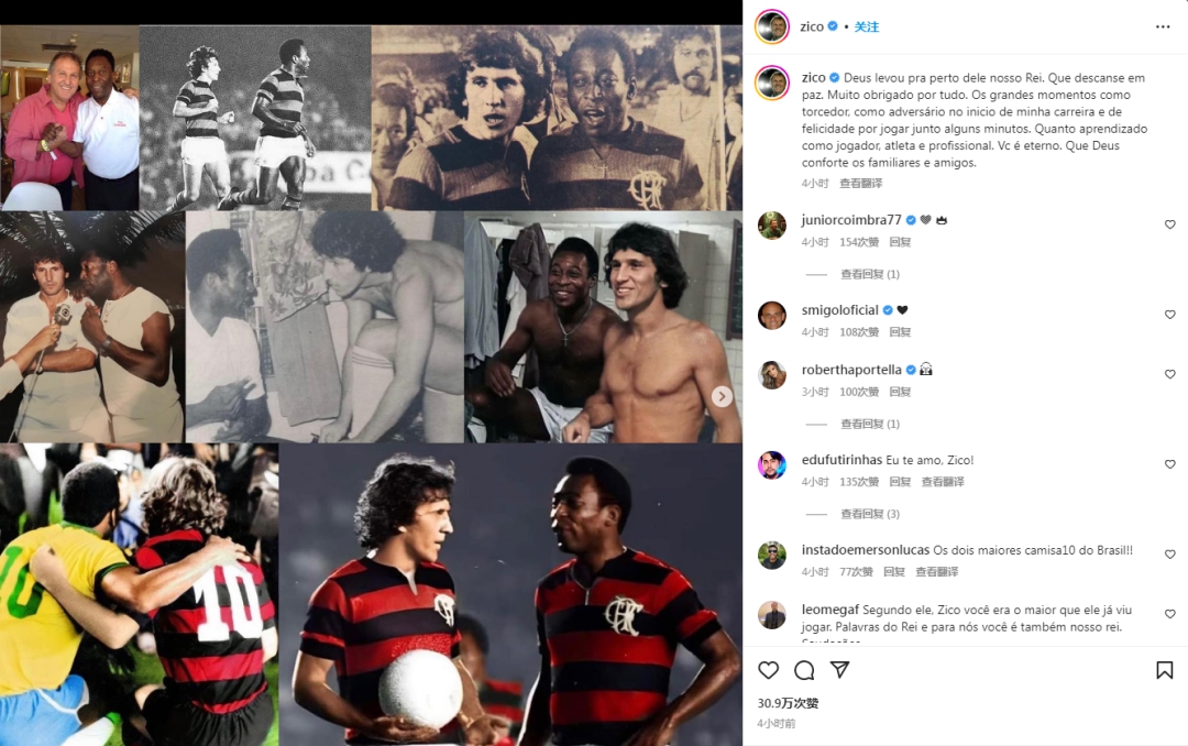 “上帝想看我们的国王了。愿他安息,非常感谢他给足球世界带来的一切,伟大的传奇。你是我的偶像,有幸能在我生涯的初期与你同场竞技。”作为巴足球历史上的传奇中场,济科有着“白贝利”的绰号。如今送别昔日并肩作战的偶像,济科直言贝利将名垂千古。