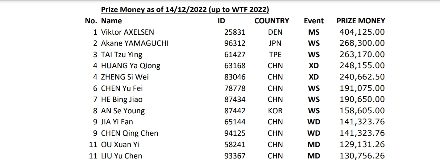 世界羽联日前公布了2022赛季羽毛球运动员的收入排行榜。过去一年中,赢得6项巡回赛冠军的丹麦选手维克多·安赛龙以404,125美元高居榜首。日本选手山口茜以268,300美元排名第二。排名第三的是中国台北选手戴资颖。