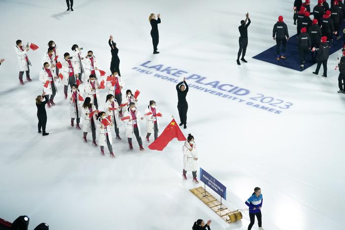 据中国大学生体育协会消息,当地时间1月12日,第31届世界大学生冬季运动会在美国普莱西德湖奥林匹克中心开幕。中国大学生体育代表团派出25名运动员参加3个大项11个小项的比赛。 中国大学生体育代表团旗手由来自北京体育大学的女子冰壶运动员韩雨担任。此次中国大学生体育代表团共49人,其中25名运动员将参加短道速滑、女子冰壶、单板滑雪3个大项11个小项的比赛。