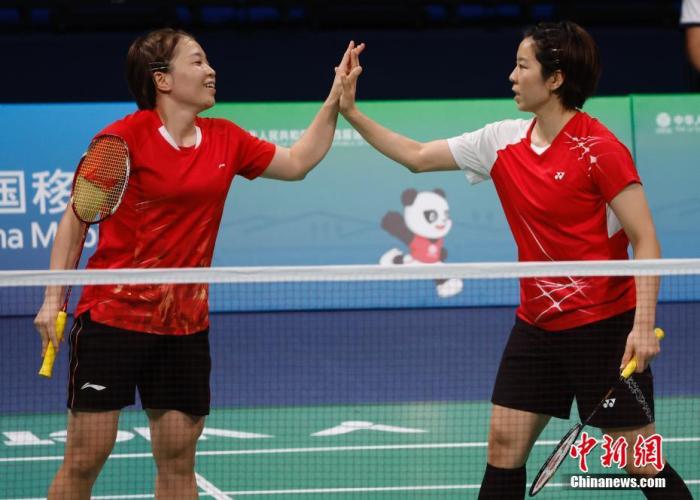 资料图:9月17日,在西安举行的第十四届全运会羽毛球女子双打决赛中,联合队选手贾一凡、陈清晨以2比0的总比分战胜湖北队选手李茵晖、杜玥,获得冠军。图为贾一凡/陈清晨(左)在庆祝。 中新社记者 毛建军 摄