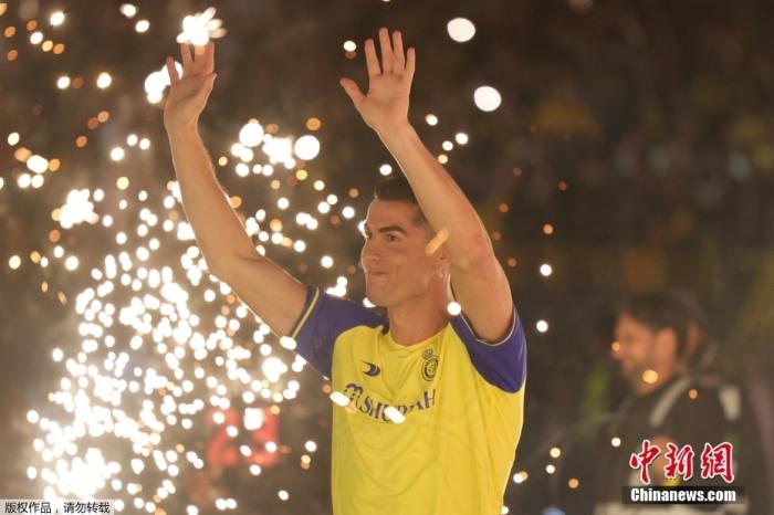 资料图:当地时间2023年1月3日,沙特利雅得胜利为C罗举行了亮相仪式。亮相仪式过后,C罗与球队汇合开始了首训。据介绍,此次亮相仪式的全部门票收入将分配用于慈善工作。图为C罗向球迷挥手致意。