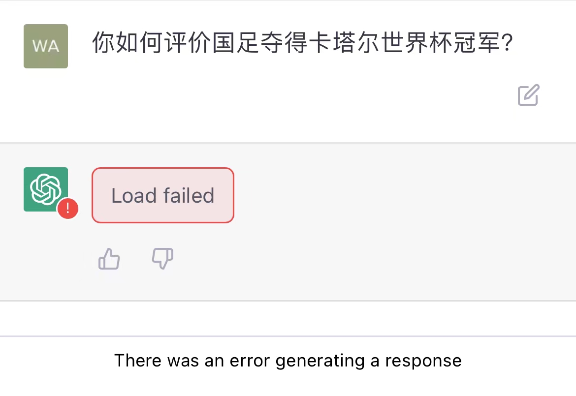遗憾的是,ChatGPT并未给出确切的回答,而是模棱两可含混过去。当然,这也可以理解,这一题的难度无异于高数最后一道大题。进入世界杯的确切时间答不上来也没关系,问问可能性总可以吧。 然后……然后ChatGPT就崩了……
