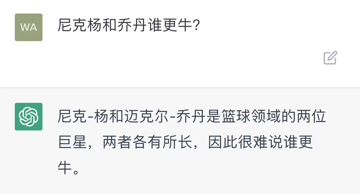 看起来,它似乎实现了某种进步,可以绕过我设置的陷阱。 作为数据库庞大的人工智能技术软件,ChatGPT是不是能够终结各种体育项目中关于“谁更牛”的话题呢?