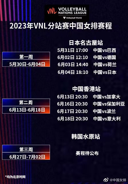 中新网2月10日电 日前,国际排联官网公布了2023年世界女排联赛赛程,其中包括中国女排的前两站赛程:日本名古屋站,中国女排将迎战巴西、德国、荷兰和日本;中国香港站,中国女排将对阵加拿大、保加利亚、波兰和意大利。第三站赛程暂未公布。(完)