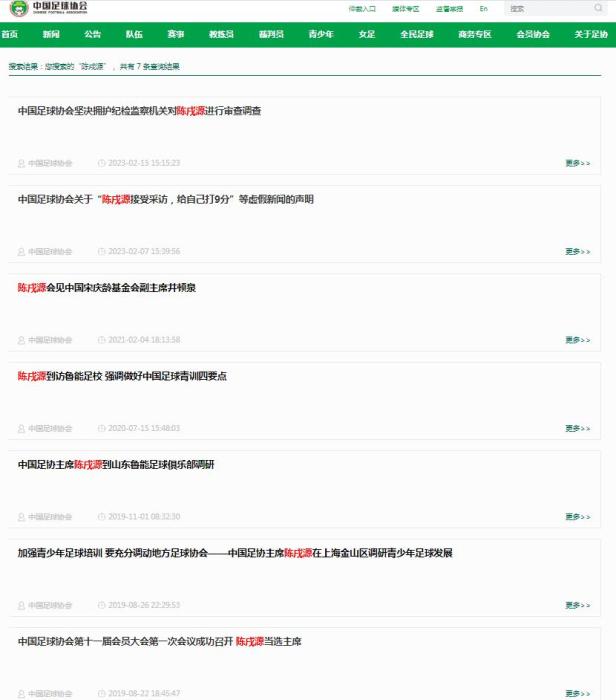 这样的表态似曾相识,可经过检索,此前一条类似的消息似乎已经从足协网站被摘掉,可互联网是有记忆的。 那条有关“中国足球协会党委召开扩大会议,通报中国足球协会执委、原秘书长刘奕涉嫌严重违法,常务副秘书长兼国管部部长陈永亮涉嫌严重违纪违法,目前正在接受纪检监察机关调查”的消息中,中国足协主席陈戌源出席了会议。 根据公告内容,除了同样的“坚决拥护、坚决支持纪检监察机关的调查”外,那场会议还强调:“协会工作人员要始终牢记党纪国法面前没有例外,自觉接受监督,依法用权、秉公用权、廉洁用权,知敬畏、存戒惧、守底线,努力营造风清气正的足球生态。” 如今看来颇显讽刺的消息已从来源处消失,至于原因,那就无从探寻了。