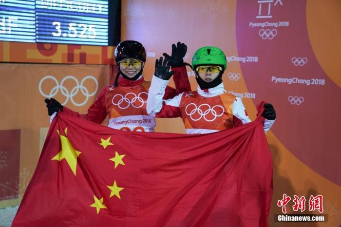 资料图:平昌冬奥会自由式滑雪女子空中技巧决赛,白俄罗斯选手胡斯科娃夺得金牌,中国女将张鑫、孔凡钰分别为中国代表团拿到银牌、铜牌。图为张鑫、孔凡钰展开国旗挥手致意。 中新社记者 崔楠 摄