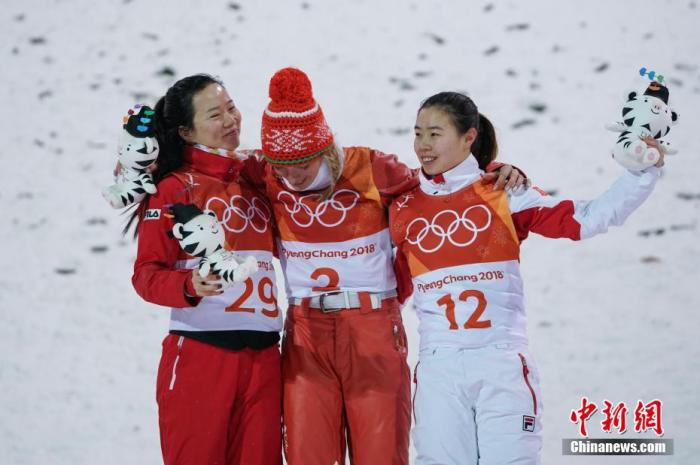 资料图:平昌冬奥会自由式滑雪女子空中技巧决赛,最终白俄罗斯选手胡斯科娃夺得金牌,中国女将张鑫、孔凡钰分别为中国代表团拿到银牌、铜牌。图为获得前三名的选手合影。 中新社记者 崔楠 摄