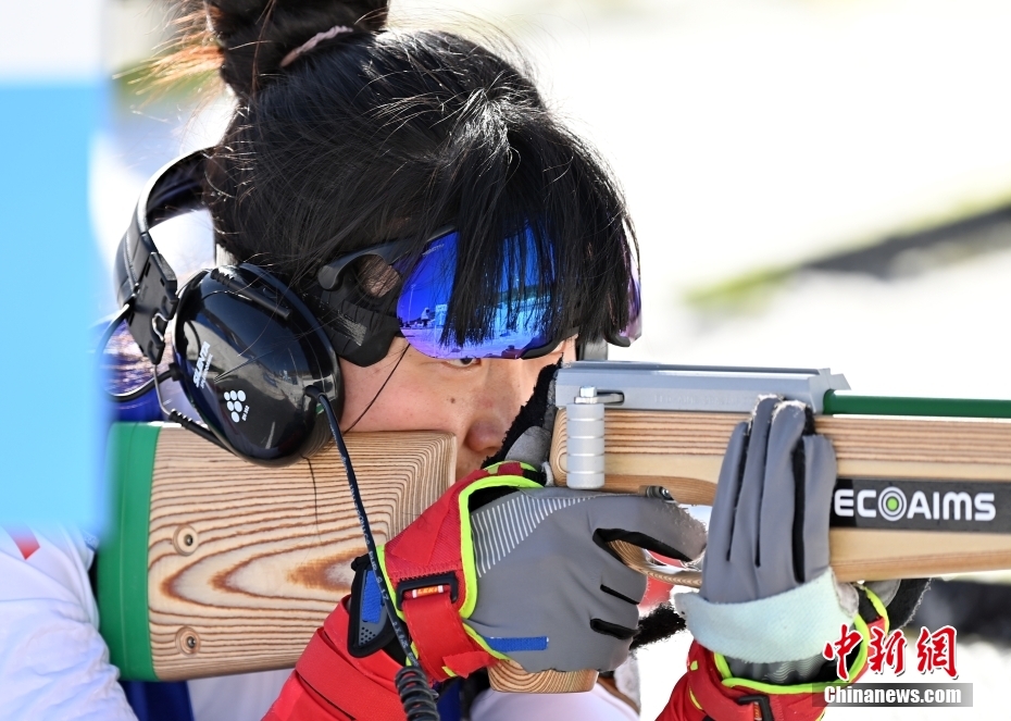 资料图:2022年3月8日,北京冬残奥会残奥冬季两项女子中距离-视障项目决赛在张家口国家冬季两项中心举行,中国选手王跃以43分16秒3的成绩获得第三名。图为王跃在射击靶位上听音瞄准。 中新社记者 侯宇 摄