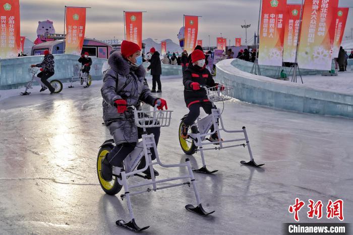 图为参加中国残疾人冰雪运动季北方主场活动的人在骑冰上自行车。 孙汉仑 摄