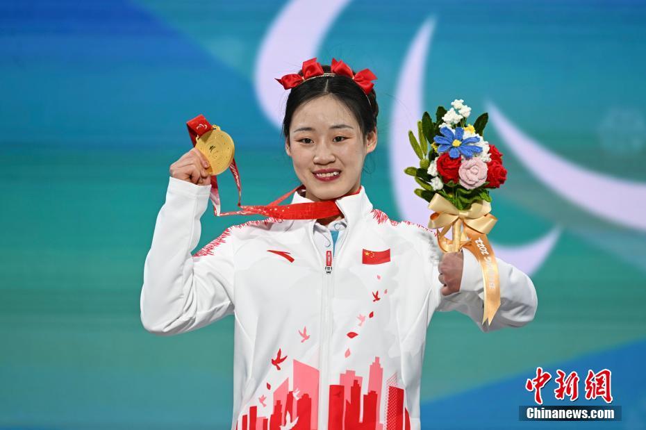 资料图:2022年3月11日,北京冬残奥会残奥高山滑雪女子大回转 - 站姿项目颁奖仪式在延庆颁奖广场举行。图为获得金牌的中国选手张梦秋展示奖牌。 中新社记者 杨华峰 摄