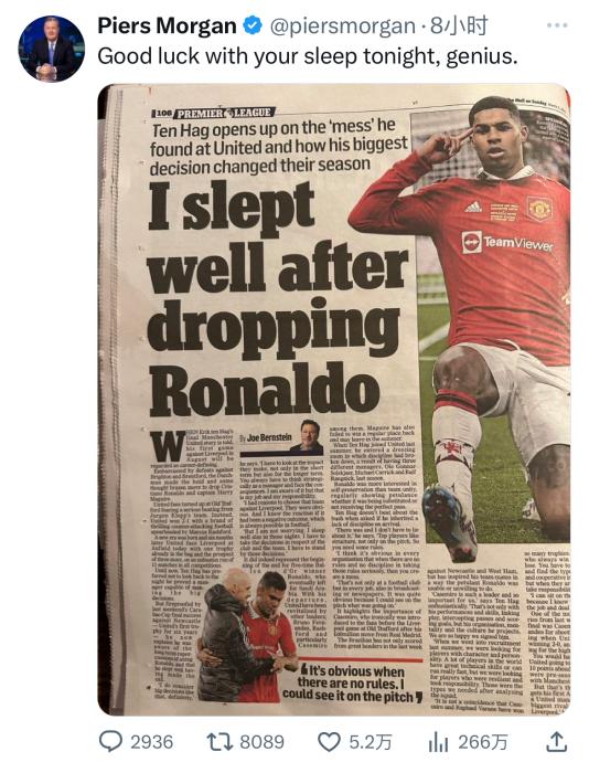 不过最近几年,曼联可就风采不再了。 今年2月,曼联夺得了2022-23赛季英格兰联赛杯冠军,这是曼联足球俱乐部近6年来的首个冠军。 这看着是个好消息,但是估计球迷笑着笑着就哭了——六年时间就拿了个联赛杯冠军,大名鼎鼎的“红魔”到底是咋沦落成这样的? 在本场“双红会”曼联被利物浦“暴打”之后,主持人皮尔斯·摩根在社交媒体发布一张图片并配文:希望你今晚能睡好,天才。图片中是曼联主帅滕哈格的采访内容,滕哈格当时说,弃用C罗之后自己睡得很好。
