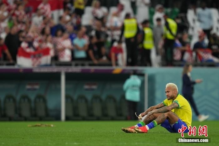 资料图:卡塔尔世界杯1/4决赛,克罗地亚队在点球大战中战胜巴西队,晋级世界杯4强。图为内马尔失落地坐在球场中。中新社记者 崔楠 摄