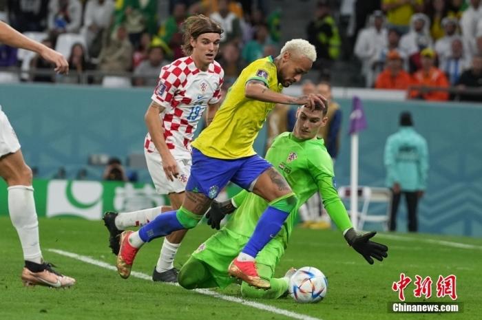 资料图:卡塔尔世界杯1/4决赛,巴西球员内马尔(黄)带球越过克罗地亚门将。中新社记者 崔楠 摄