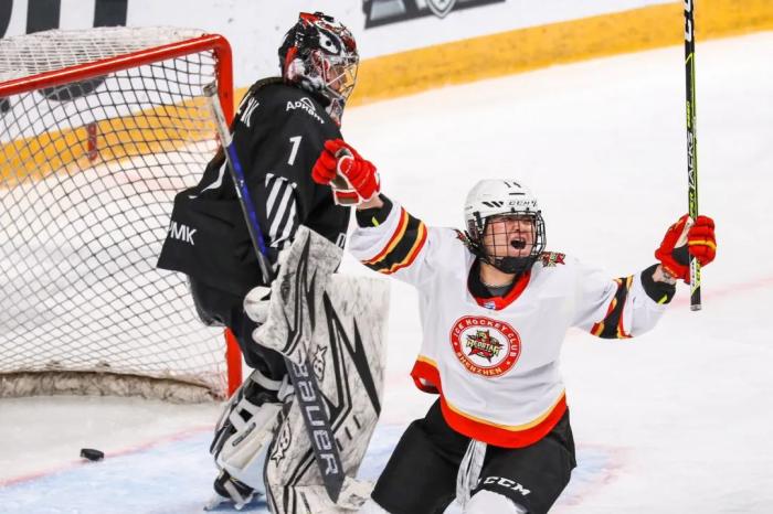 2022年11月14日,深圳昆仑鸿星女子冰球队和白熊队的比赛中,皮云琳进球后进行庆祝。图源深圳昆仑鸿星冰球俱乐部