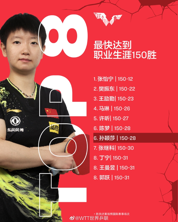 16日,WTT世界乒联官方社交媒体发文祝贺中国选手孙颖莎,“恭喜孙颖莎成为最快达到职业生涯150胜历史第六位。”