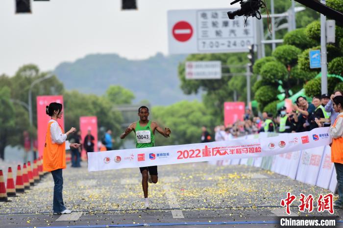 图为重庆半程马拉松男子组冠军冲线。 重庆半程马拉松赛事组委会供图