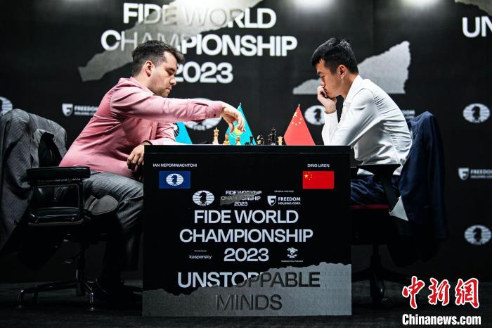 2023国际棋联国际象棋世界冠军赛9日在哈萨克斯坦首都阿斯塔纳正式开赛。在首局较量中,中国棋手丁立人与俄罗斯棋手涅波姆尼亚奇握手言和。 本次冠军赛是国际棋联本年度最重要的赛事。由于现任世界冠军、挪威棋手卡尔森放弃卫冕,新一届世界冠军将在2022世界冠军候选人赛冠亚军得主涅波姆尼亚奇和丁立人之间产生。这也是中国男子国象棋手第一次有机会冲击世界冠军宝座。 首局比赛于当地时间9日下午3时打响。丁立人走上赛台,与棋盘对面的涅波姆尼亚奇握了握手,两人都向对方笑了笑,然后坐下。 涅波姆尼亚奇执白先行。赛场十分安静,涅波姆尼亚奇常在房间里踱步,脱去外套的丁立人则静静坐在椅子上,直到走完他的棋。 当地时间9日,哈萨克斯坦阿斯塔纳,2023国际棋联国际象棋世界冠军赛当日开战。图为中国棋手丁立人(右一)与俄罗斯棋手涅波姆尼亚奇在首局比赛中。(国际棋联供图)