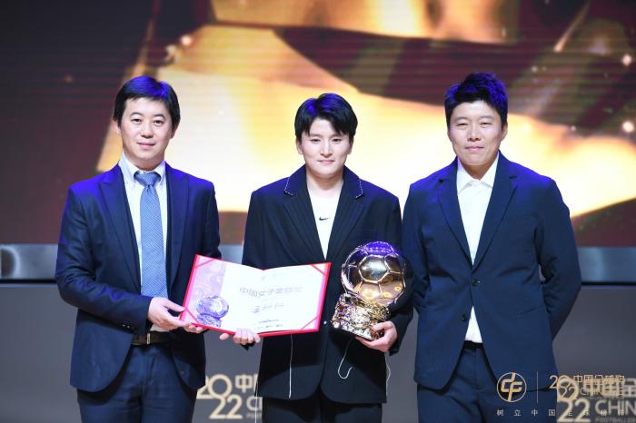 象征年度最佳中国足球教练荣誉的2022中国金帅奖,由中国女足主帅水庆霞、大连人主帅谢晖和上海申花主帅吴金贵竞逐。虽然女足亚洲杯已经过去一年有余,但中国女足在印度的高光时刻依然被人铭记。水庆霞的选票得分达到616分,远远超过了329分的谢晖和199分的吴金贵。刚刚结束欧洲拉练返回国内的水庆霞来到现场领取奖项,前中国女足主帅商瑞华为她颁发了奖杯。 与水庆霞一同刚刚回国的王珊珊,则在中国女子金球奖的评选中折桂。她在2022年印度亚洲杯奉上了攻防俱佳的表现,尤其是跌宕起伏的半决赛和决赛,她的一个个高光时刻,就是中国女足先抑后扬的缩影。王珊珊的选票得分为472分,完全压过了323分的张琳艳和278分的唐佳丽。现任中国女足教练组成员马晓旭为王珊珊颁发奖杯。