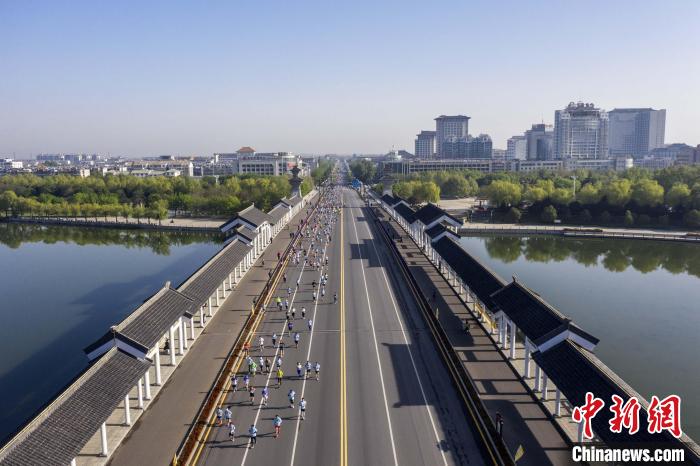参赛选手通过曲阜地标建筑——大成桥。 杨国庆 摄