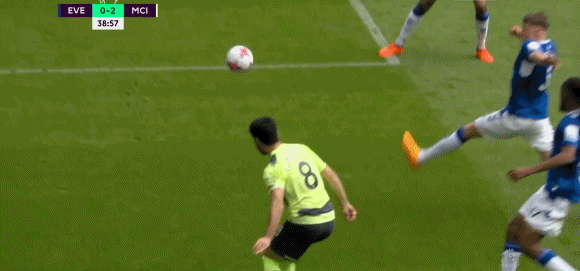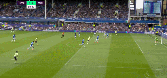埃弗顿试图复制皇马的人盯人战术,主裁判第3分钟就警告了米纳、哈兰德。然而,京多安第39分钟左路送出妙传,哈兰德以泰山压顶姿态冲顶破门。