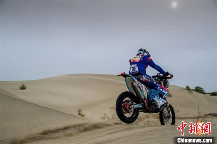003号摩托在沙漠中行驶。 环塔拉力赛官方供图