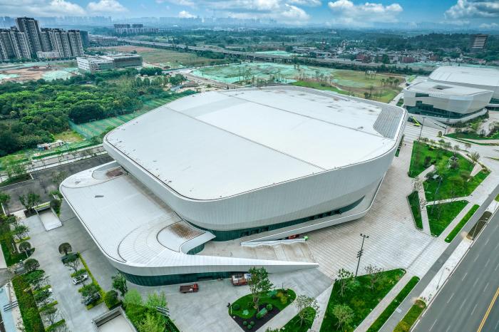 凤凰山体育公园是本届大运会篮球比赛的场馆。从空中俯瞰,形似四川盖碗茶的茶盖、茶碗与茶托。 高新体育中心体育馆